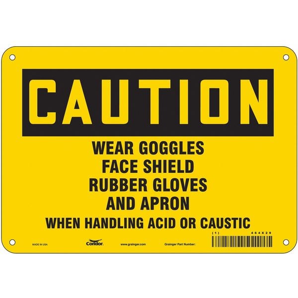 Safety Sign, Vertical Rectangle, Number of Printed Sides 1, English, Sign Format Traditional OSHA, Sign Legend Wear Goggles Face Shield Rubber Gloves And Apron When Handling Acid Or Caustic, Sign Legend Background Color Yellow, Sign Legend Style Text