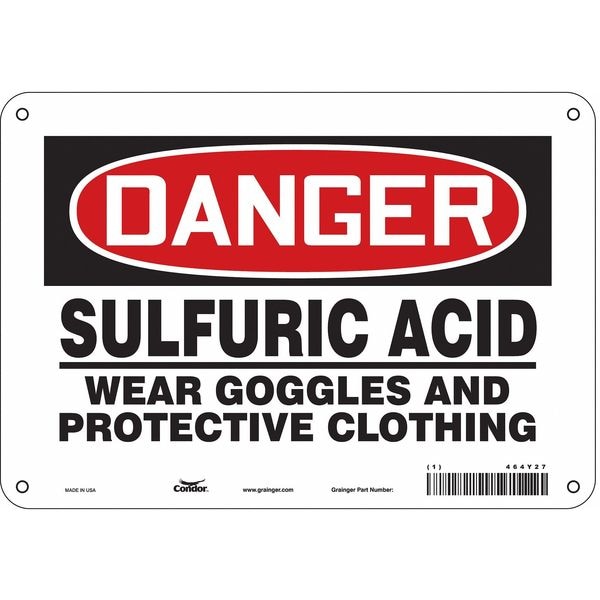 Safety Sign, Vertical Rectangle, Number of Printed Sides 1, English, Sign Format Traditional OSHA, Sign Legend Sulfuric Acid Wear Goggles And Protective Clothing, Sign Legend Background Color White, Sign Legend Style Text
