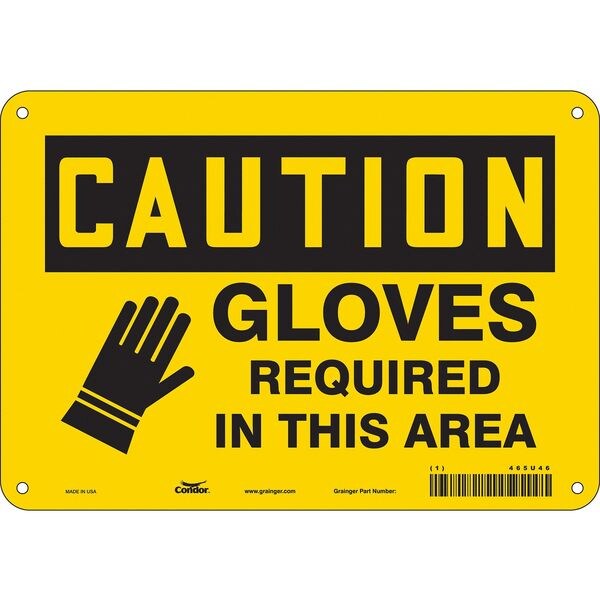 Safety Sign, Vertical Rectangle, Number of Printed Sides 1, English, Sign Format Traditional OSHA, Sign Legend Gloves Required In This Area, Sign Legend Background Color Yellow, Sign Legend Style Symbol and Text