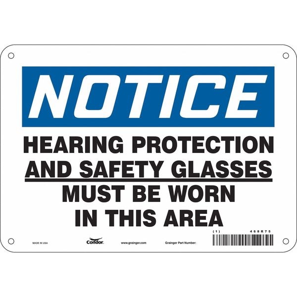 Safety Sign, Vertical Rectangle, Number of Printed Sides 1, English, Sign Format Traditional OSHA, Sign Legend Hearing Protection And Safety Glasses Must Be Worn In This Area, Sign Legend Background Color White, Sign Legend Style Text