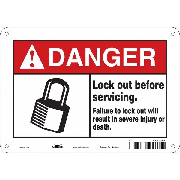 Safety Sign, Vertical Rectangle, Number of Printed Sides 1, English, Sign Format ANSI/OSHA Format, Sign Legend Lock Out Before Servicing. Failure To Lock Out Will Result In Severe Injury Or Death., Sign Legend Background Color White, Sign Legend Style Symbol and Text