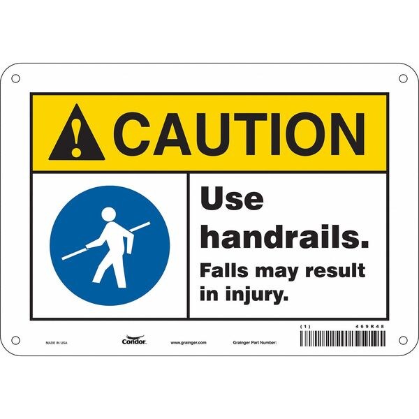 Safety Sign, Vertical Rectangle, Number of Printed Sides 1, English, Sign Format ANSI/OSHA Format, Sign Legend Use Handrails. Falls May Result In Injury, Sign Legend Background Color White, Sign Legend Style Symbol and Text