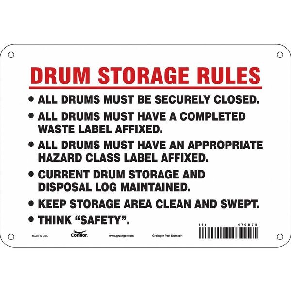 Safety Sign, Vertical Rectangle, Number of Printed Sides 1, English, Sign Format Other Format, Sign Legend Drum Storage Rules All Drums Must Be Securely Closed. All Drums Must Have A Completed Waste Label Affixed. All Drums Must Have An Appropriate Hazard Class Label Affixed. Current Drum Storage And Disposal Log Maintained. Keep Storage Area Clean And Swept., Sign Legend Background Color White, Sign Legend Style Text