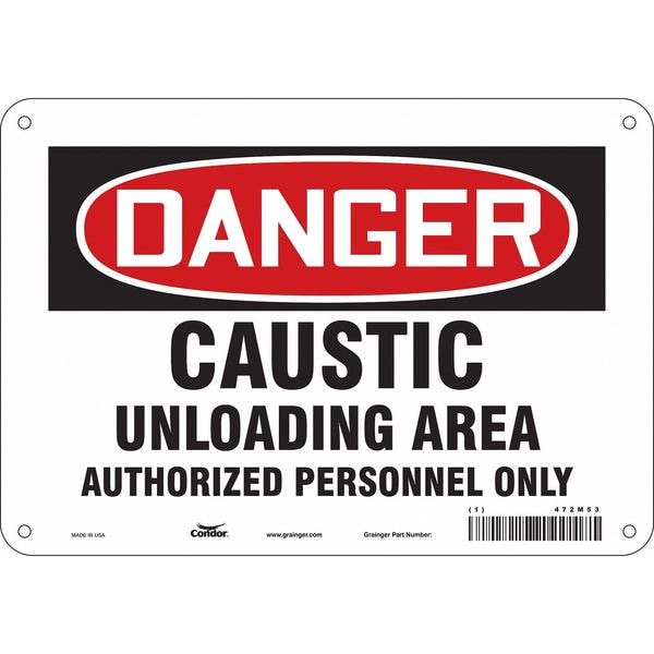 Safety Sign, Vertical Rectangle, Number of Printed Sides 1, English, Sign Format Traditional OSHA, Sign Legend Caustic Unloading Area Authorized Personnel Only, Sign Legend Background Color White, Sign Legend Style Text