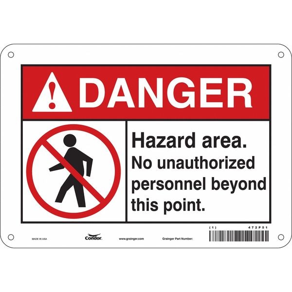 Safety Sign, Vertical Rectangle, Number of Printed Sides 1, English, Sign Format ANSI/OSHA Format, Sign Legend Hazard Area. No Unauthorized Personnel Beyond This Point., Sign Legend Background Color White, Sign Legend Style Symbol and Text