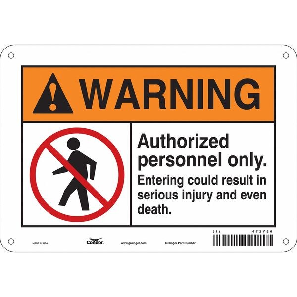 Safety Sign, Vertical Rectangle, Number of Printed Sides 1, English, Sign Format Traditional OSHA, Sign Legend Authorized Personnel Only. Entering Could Result In Serious Injury And Even Death., Sign Legend Background Color White, Sign Legend Style Symbol and Text