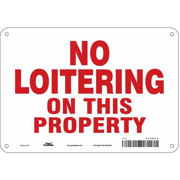 Safety Sign, Vertical Rectangle, Number of Printed Sides 1, English, Sign Legend No Loitering On This Property, Sign Legend Background Color White, Sign Legend Style Text