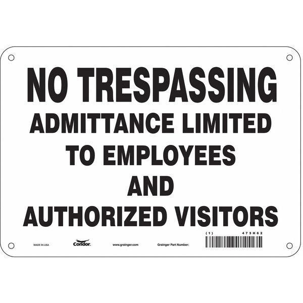 Safety Sign, Vertical Rectangle, Number of Printed Sides 1, English, Sign Format Other Format, Sign Legend No Trespassing Admittance Limited To Employees And Authorized Visitors, Sign Legend Background Color White, Sign Legend Style Text
