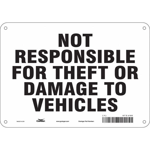Safety Sign, Vertical Rectangle, Number of Printed Sides 1, English, Sign Legend Not Responsible For Theft Or Damage To Vehicles, Sign Legend Background Color White, Sign Legend Style Text