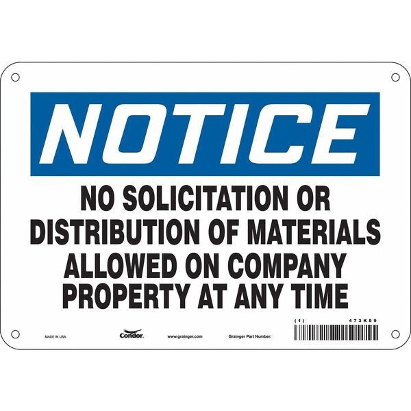 Safety Sign, Vertical Rectangle, Number of Printed Sides 1, English, Sign Format Traditional OSHA, Sign Legend No Solicitation Or Distribution Of Materials Allowed On Company Property At Any Time, Sign Legend Background Color White, Sign Legend Style Text