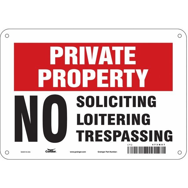 Safety Sign, Vertical Rectangle, Number of Printed Sides 1, English, Sign Format Other Format, Sign Legend No Soliciting Loitering Trespassing, Sign Legend Background Color Red, White, Sign Legend Style Text