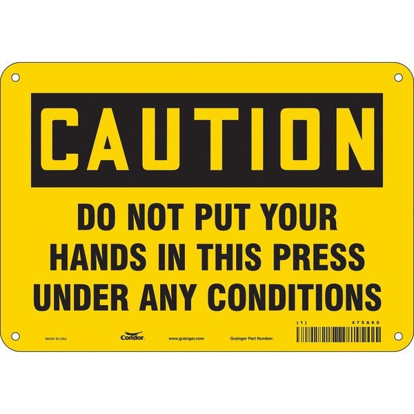 Safety Sign, Vertical Rectangle, Number of Printed Sides 1, English, Sign Format Traditional OSHA, Sign Legend Do Not Put Your Hands In This Press Under Any Conditions, Sign Legend Background Color Yellow, Sign Legend Style Text