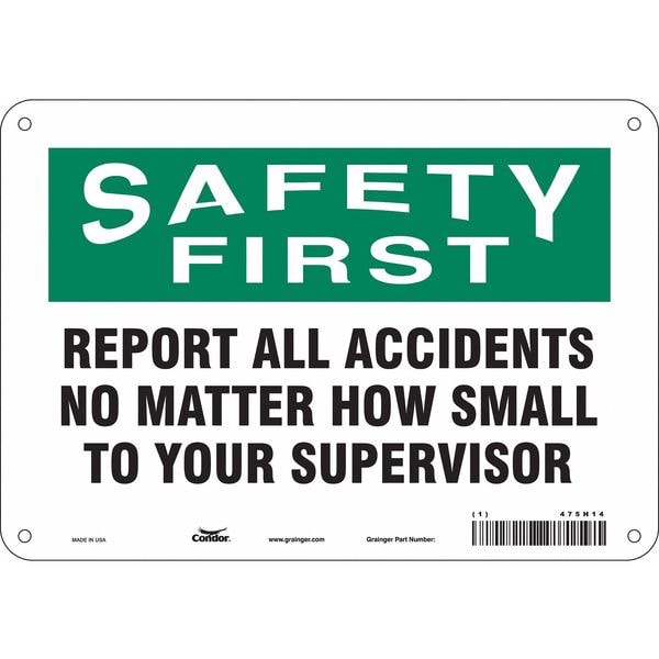 Safety Sign, Vertical Rectangle, Number of Printed Sides 1, English, Sign Format Traditional OSHA, Sign Legend Report All Accidents No Matter How Small To Your Supervisor, Sign Legend Background Color White, Sign Legend Style Text