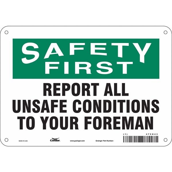 Safety Sign, Vertical Rectangle, Number of Printed Sides 1, English, Sign Format Traditional OSHA, Sign Legend Report All Unsafe Conditions To Your Foreman, Sign Legend Background Color White, Sign Legend Style Text