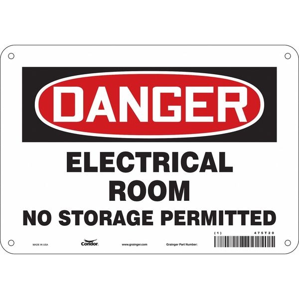 Safety Sign, Vertical Rectangle, Number of Printed Sides 1, English, Sign Format Traditional OSHA, Sign Legend Electrical Room No Storage Permitted, Sign Legend Background Color White, Sign Legend Style Text