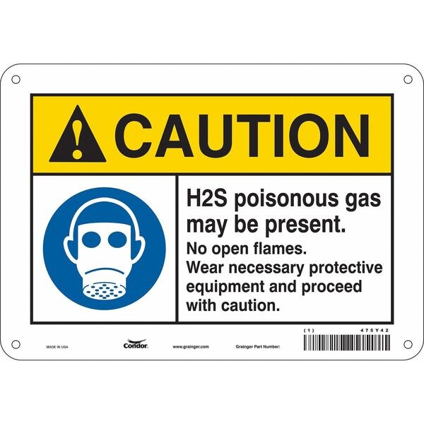 Safety Sign, Vertical Rectangle, Number of Printed Sides 1, English, Sign Format ANSI/OSHA Format, Sign Legend H2S Poisonous Gas May Be Present. No Open Flames. Wear Necessary Protective Equipment And Proceed With Caution., Sign Legend Background Color White, Sign Legend Style Symbol and Text