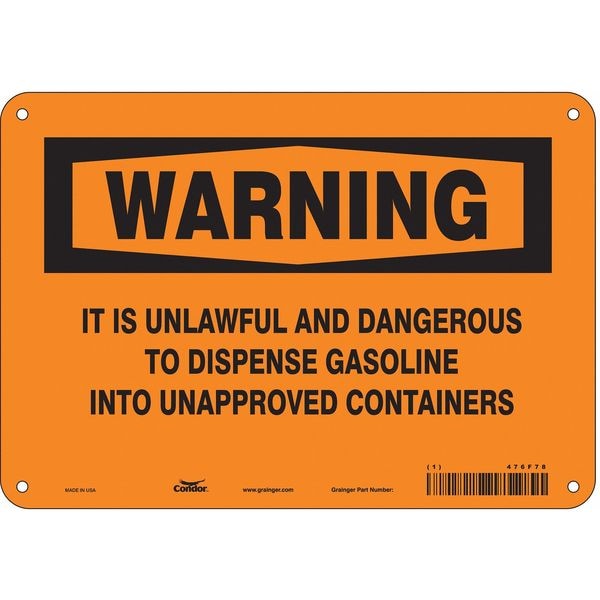 Safety Sign, Vertical Rectangle, Number of Printed Sides 1, English, Sign Format Traditional OSHA, Sign Legend It Is Unlawful And Dangerous To Dispense Gasoline Into Unapproved Containers, Sign Legend Background Color Orange, Sign Legend Style Text