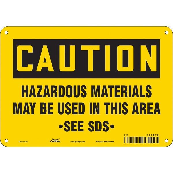 Safety Sign, Vertical Rectangle, Number of Printed Sides 1, English, Sign Format Traditional OSHA, Sign Legend Hazardous Materials May Be Used In This Area See SDS, Sign Legend Background Color Yellow, Sign Legend Style Text