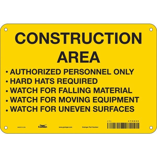 Safety Sign, Vertical Rectangle, Number of Printed Sides 1, English, Sign Format Other Format, Sign Legend Construction Area Authorized Personnel Only Hard Hats Required Watch For Falling Material Watch For Moving Equipment Watch For Uneven Surfaces, Sign Legend Background Color Yellow, Sign Legend Style Text