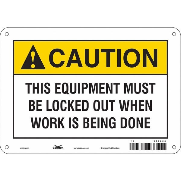 Safety Sign, Vertical Rectangle, Number of Printed Sides 1, English, Sign Format ANSI/OSHA Format, Sign Legend This Equipment Must Be Locked Out When Work Is Being Done, Sign Legend Background Color White, Sign Legend Style Symbol and Text