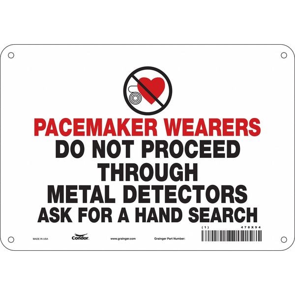 Safety Sign, Vertical Rectangle, Number of Printed Sides 1, English, Sign Format Other Format, Sign Legend Pacemaker Wearers Do Not Proceed Through Metal Detectors Ask For A Hand Search, Sign Legend Background Color White, Sign Legend Style Symbol and Text
