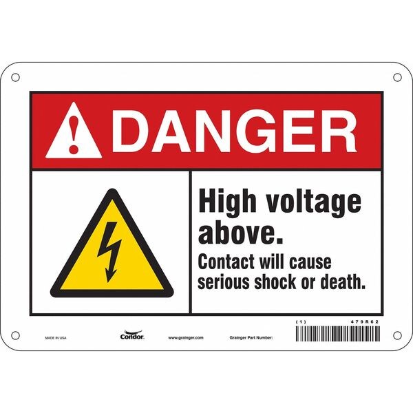 Safety Sign, Vertical Rectangle, Number of Printed Sides 1, English, Sign Format ANSI/OSHA Format, Sign Legend High Voltage Above. Contact Will Cause Serious Shock Or Death., Sign Legend Background Color White, Sign Legend Style Symbol and Text