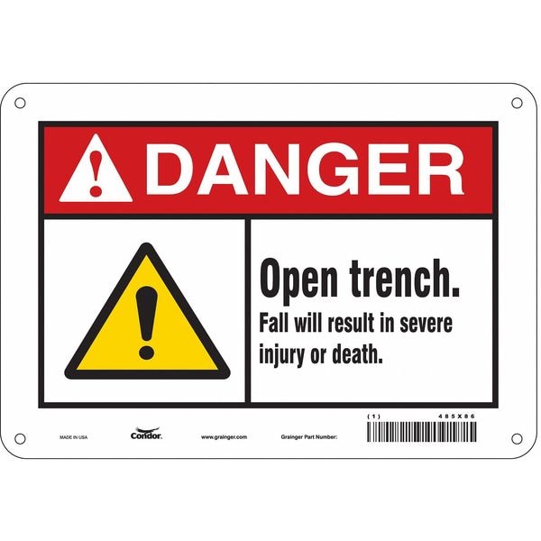 Safety Sign, Vertical Rectangle, Number of Printed Sides 1, English, Sign Format ANSI/OSHA Format, Sign Legend Open Trench. Fall Will Result In Severe Injury Or Death., Sign Legend Background Color White, Sign Legend Style Symbol and Text