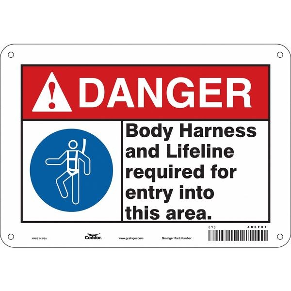 Safety Sign, Vertical Rectangle, Number of Printed Sides 1, English, Sign Format ANSI/OSHA Format, Sign Legend Body Harness And Lifeline Required For Entry Into This Area., Sign Legend Background Color White, Sign Legend Style Symbol and Text
