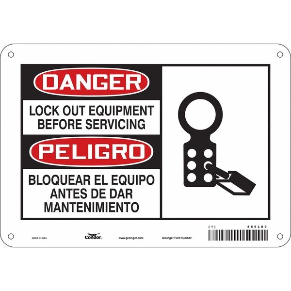 Safety Sign, Vertical Rectangle, Number of Printed Sides 1, English, Spanish, Sign Format Traditional OSHA, Sign Legend Lock Out Equipment Before Servicing/Bloquear El Equipo Antes De Dar Mantenimiento, Sign Legend Background Color White, Sign Legend Style Symbol and Text