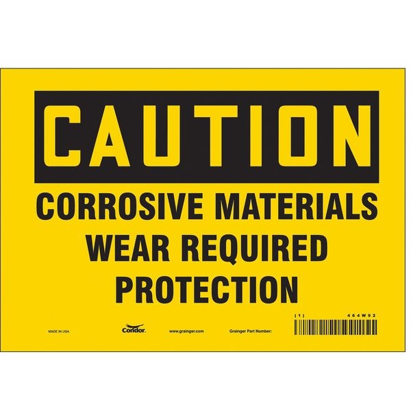 Safety Sign, Vertical Rectangle, Number of Printed Sides 1, English, Sign Format Traditional OSHA, Sign Legend Corrosive Materials Wear Required Protection, Sign Legend Background Color Yellow, Sign Legend Style Text