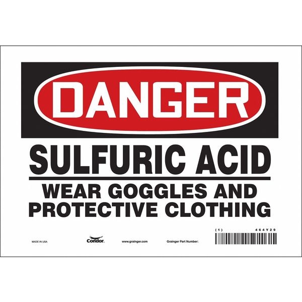 Safety Sign, Vertical Rectangle, Number of Printed Sides 1, English, Sign Format Traditional OSHA, Sign Legend Sulfuric Acid Wear Goggles And Protective Clothing, Sign Legend Background Color White, Sign Legend Style Text