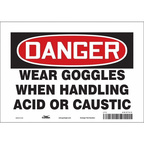 Safety Sign, Vertical Rectangle, Number of Printed Sides 1, English, Sign Format Traditional OSHA, Sign Legend Wear Goggles When Handling Acid Or Caustic, Sign Legend Background Color White, Sign Legend Style Text