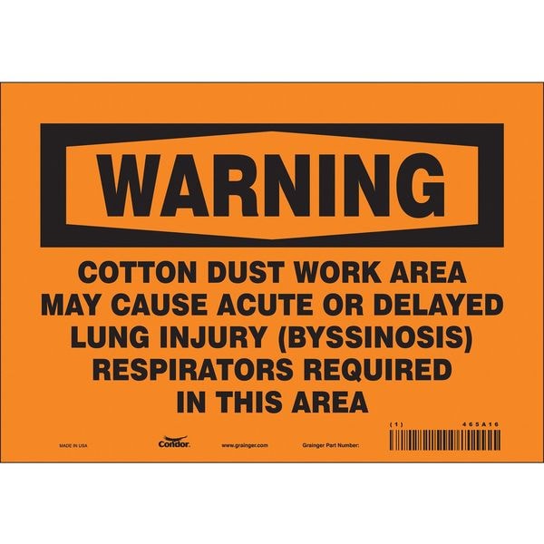 Safety Sign, Vertical Rectangle, Number of Printed Sides 1, English, Sign Format Traditional OSHA, Sign Legend Cotton Dust Work Area May Cause Acute Or Delayed Lung Injury (Byssnosis) Respirators Required In This Area, Sign Legend Background Color Orange, Sign Legend Style Text