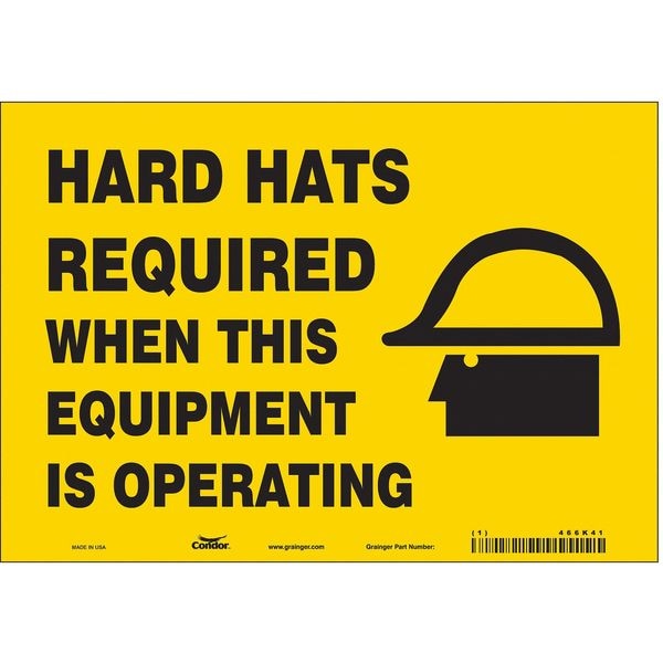 Safety Sign, Vertical Rectangle, Number of Printed Sides 1, English, Sign Format Other Format, Sign Legend Hard Hats Required When This Equipment Is Operating, Sign Legend Background Color Yellow, Sign Legend Style Symbol and Text