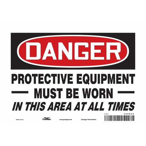 Safety Sign, Vertical Rectangle, Number of Printed Sides 1, English, Sign Format Traditional OSHA, Sign Legend Protective Equipment Must Be Worn In This Area At All Times, Sign Legend Background Color White, Sign Legend Style Text
