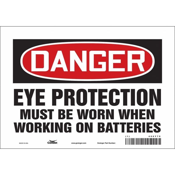Safety Sign, Vertical Rectangle, Number of Printed Sides 1, English, Sign Format Traditional OSHA, Sign Legend Eye Protection Must Be Worn When Working On Batteries, Sign Legend Background Color White, Sign Legend Style Text