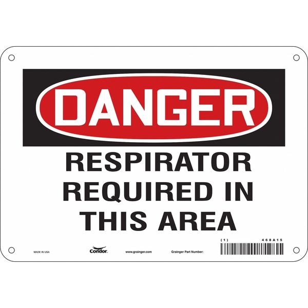 Safety Sign, Vertical Rectangle, Number of Printed Sides 1, English, Sign Format Traditional OSHA, Sign Legend Respirator Required In This Area, Sign Legend Background Color White, Sign Legend Style Text