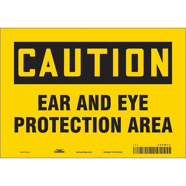 Safety Sign, Vertical Rectangle, Number of Printed Sides 1, English, Sign Format Traditional OSHA, Sign Legend Ear And Eye Protection Area, Sign Legend Background Color Yellow, Sign Legend Style Text