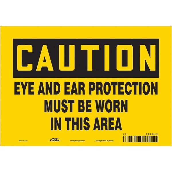 Safety Sign, Vertical Rectangle, Number of Printed Sides 1, English, Sign Format Traditional OSHA, Sign Legend Eye And Ear Protection Must Be Worn In This Area, Sign Legend Background Color Yellow, Sign Legend Style Text