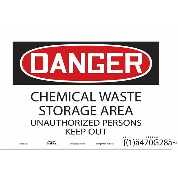 Safety Sign, Vertical Rectangle, Number of Printed Sides 1, English, Sign Format Traditional OSHA, Sign Legend Chemical Waste Storage Area Unauthorized Persons Keep Out, Sign Legend Background Color White, Sign Legend Style Text