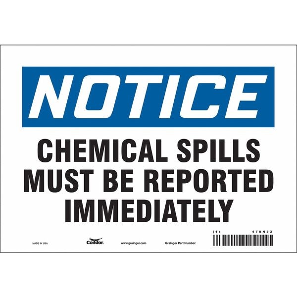 Safety Sign, Vertical Rectangle, Number of Printed Sides 1, English, Sign Format Traditional OSHA, Sign Legend Chemical Spills Must Be Reported Immediately, Sign Legend Background Color White, Sign Legend Style Text