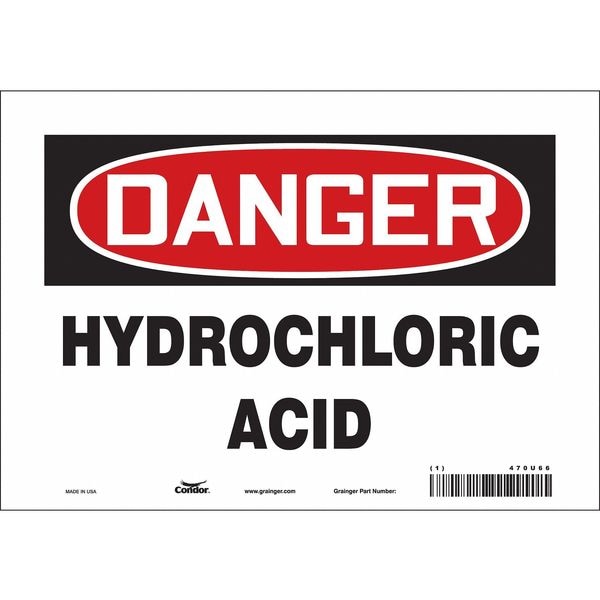 Safety Sign, Vertical Rectangle, Number of Printed Sides 1, English, Sign Format Traditional OSHA, Sign Legend Hydrochloric Acid, Sign Legend Background Color White, Sign Legend Style Text