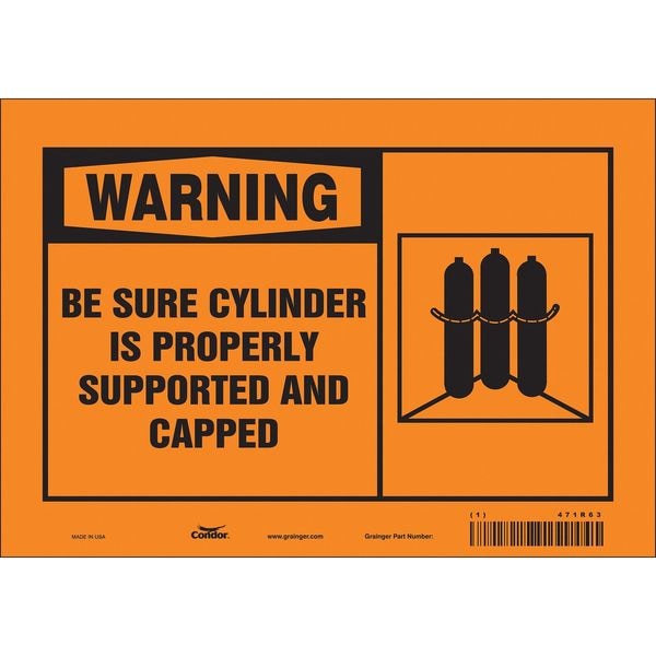 Safety Sign, Vertical Rectangle, Number of Printed Sides 1, English, Sign Format Traditional OSHA, Sign Legend Be Sure Cylinder Is Properly Supported And Capped, Sign Legend Background Color Orange, Sign Legend Style Symbol and Text