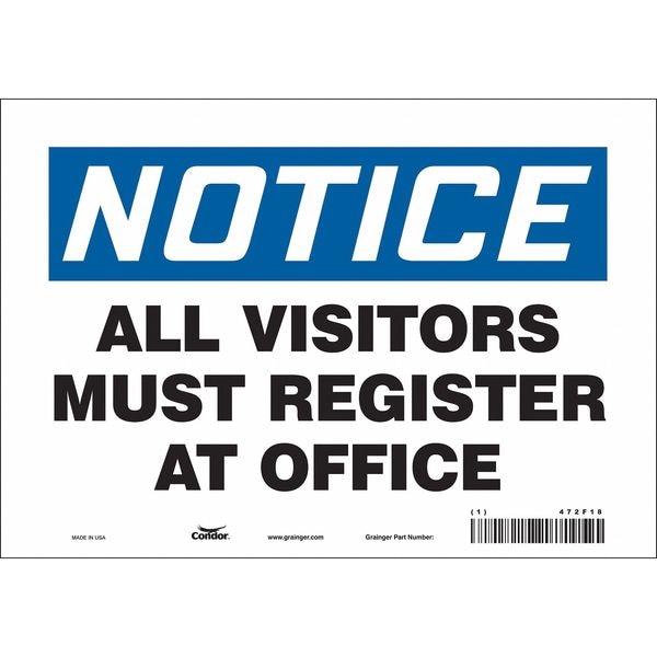Safety Sign, Vertical Rectangle, Number of Printed Sides 1, English, Sign Legend All Visitors Must Register At Office, Sign Legend Background Color White, Sign Legend Style Text