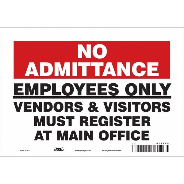 Safety Sign, Vertical Rectangle, Number of Printed Sides 1, English, Sign Format Other Format, Sign Legend Employees Only Vendors & Visitors Must Register At Main Office, Sign Legend Background Color Red, White, Sign Legend Style Text