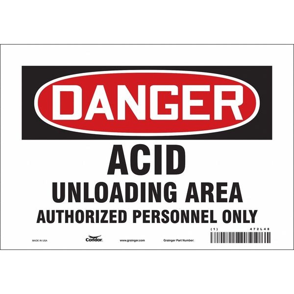 Safety Sign, Vertical Rectangle, Number of Printed Sides 1, English, Sign Format Traditional OSHA, Sign Legend Acid Unloading Area Authorized Personnel Only, Sign Legend Background Color White, Sign Legend Style Text