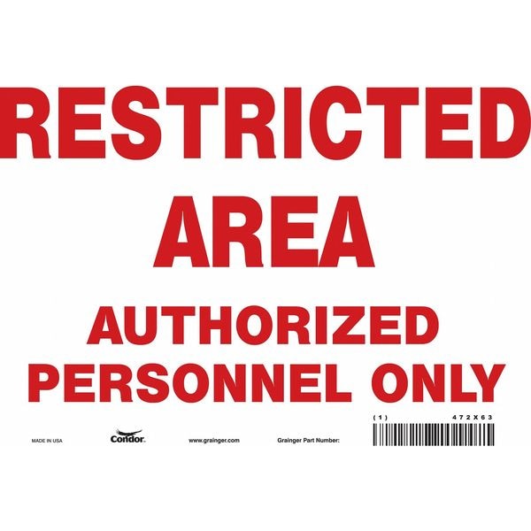 Safety Sign, Vertical Rectangle, Number of Printed Sides 1, English, Sign Format Other Format, Sign Legend Restricted Area Authorized Personnel Only, Sign Legend Background Color White, Sign Legend Style Text