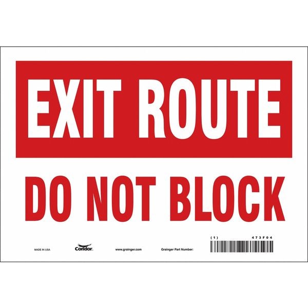 Safety Sign, Vertical Rectangle, Number of Printed Sides 1, English, Sign Legend Exit Route Do Not Block, Sign Legend Background Color Red, White, Sign Legend Style Text