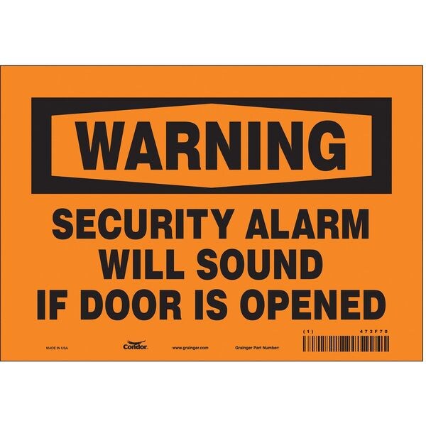 Safety Sign, Vertical Rectangle, Number of Printed Sides 1, English, Sign Legend Security Alarm Will Sound If Door Is Opened, Sign Legend Background Color Orange, Sign Legend Style Text