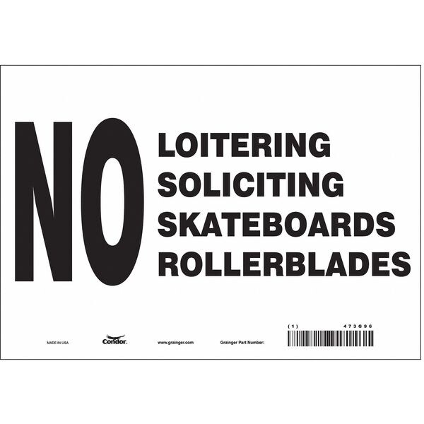 Safety Sign, Vertical Rectangle, Number of Printed Sides 1, English, Sign Legend No Loitering Soliciting Skateboards Rollerblades, Sign Legend Background Color White, Sign Legend Style Text